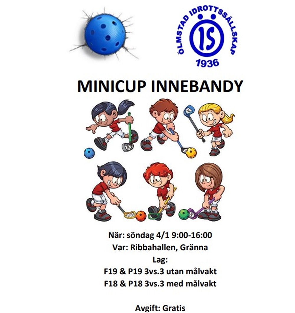 Innebandyskolan har blivit inbjudna av Ölmstad IS Innebandy till en minicup söndagen den 4 januari i Ribbahallen i Gränna. De genomför en turnering mellan 9:00-16:00 i yngre åldersklasser och vi är inbjudna till klassen 2019 som spelar 3 mot 3 (utan målvakt).